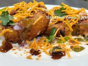 Crispy, golden potato patties stuffed with a spiced lentil filling, topped with cool yoghurt, tangy tamarind, and spicy green chutneys. Garnished with crunchy sev and fresh coriander, this is the perfect balance of sweet, spicy, and tangy flavours.