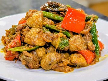 Marinated chicken cubes stir fried with green peppers, onions and other home made sauces.