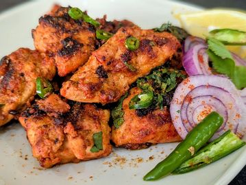Juicy boneless chicken pieces marinated in yoghurt, aromatic spices and grilled to perfection. Served with fresh salad and mint dip.