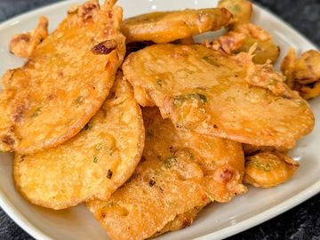 2 marinated eggs cut into quarters coated in a spiced chickpea flour batter and deep fried until golden and crispy.