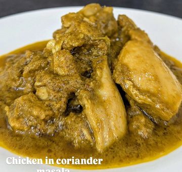 Tender chicken cooked in a fresh coriander-based masala with onions, tomatoes and spices.