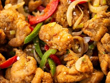 Crispy chicken pieces tossed with fresh green chillies, green peppers, garlic, and onions. Seasoned with a punchy spice blend for a nice and spicy finish.