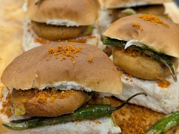 ( Potato fritter ) in a soft pav fresh chutneys, flavorful dry garlic chutney and served with crispy fried green chilies for that perfect street style extra kick 🌶️