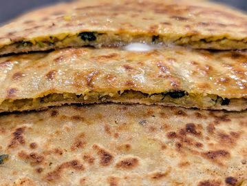 A crispy, golden-brown paratha stuffed with finely grated cauliflower, fresh ginger, green chillies and fresh herbs. Pan-seared until flaky and perfectly seasoned with aromatic spices for an authentic home-cooked taste.