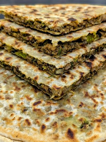 Soft paratha stuffed with flavourful, spiced minced chicken. Pan-cooked until golden and crisp outside, juicy and tasty inside.