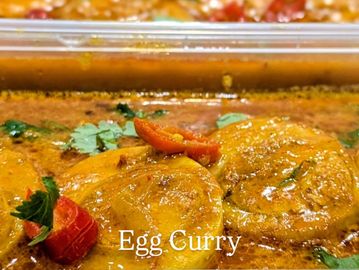 Whole boiled eggs cooked in onions, tomatoes, ground spices and herbs.