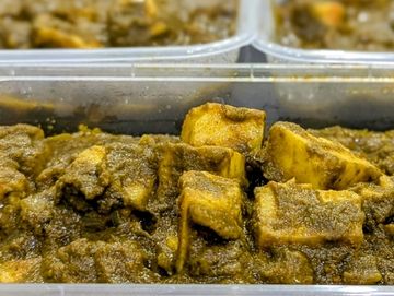 Chicken cubes cooked in spinach and other spices.