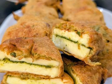 Soft Paneer layered with green chutney, coated in a spiced batter, crispy outside and soft inside.