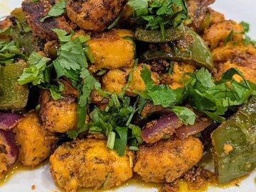 Stir fried cubes of Paneer, onion and green peppers marinated with yogurt and spices.