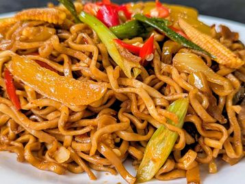 Stir fried noodles with vegetable, garlic, ginger, soy sauce, chilli sauce and spring onions