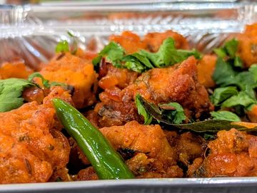 Bite size pieces of marinated fried chicken stir fried in curry leaves and other spices.