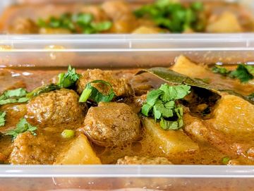 Soya nuggets and potatoes cooked in a rich tomato based gravy.