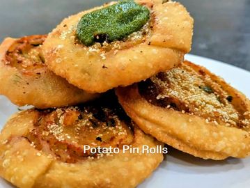 Pinwheel shaped spiced potato snack. Served with mint and coriander chutney.