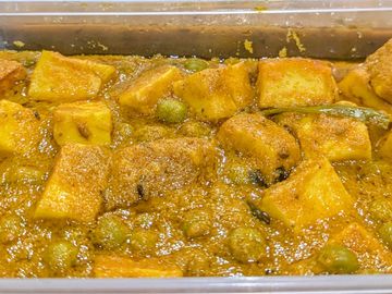 Paneer cubes and peas cooked in a rich tomato gravy with herbs and spices.