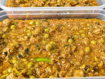 Soya granules and peas cooked in onions, tomatoes, green chillies and spices.